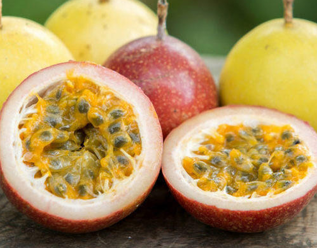 Passiflora edulis, commonly known as passion fruit, is a vine species of passion flower native to southern Brazil. It is cultivated commercially in tropical and subtropical areas for its sweet, seedy fruit. The fruit is a pepo, a type of berry, round to oval, either yellow or dark purple at maturity, with a soft to firm, juicy interior filled with numerous seeds. The fruit is both eaten and juiced, with the juice often added to other fruit juices to enhance aroma. There are two main varieties: a purple-fruited type, P. edulis f. edulis, and the yellow-fruited P. edulis f. flavicarpa.